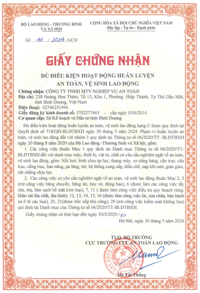 Trong 15 năm hoạt động dịch vụ về an toàn, vệ sinh lao động đơn vị đã thực hiện đào tạo hàng chục nghìn cán bộ quản lý, người làm công tác ATVSLĐ cho các doanh nghiệp, tập đoàn, tổng công ty và hàng ngàn lượt người lao động trên địa bàn Bình Dương và cả nước; phối hơp với trường đào tạo sơ cấp nghề cho hàng chục nghìn người lao động